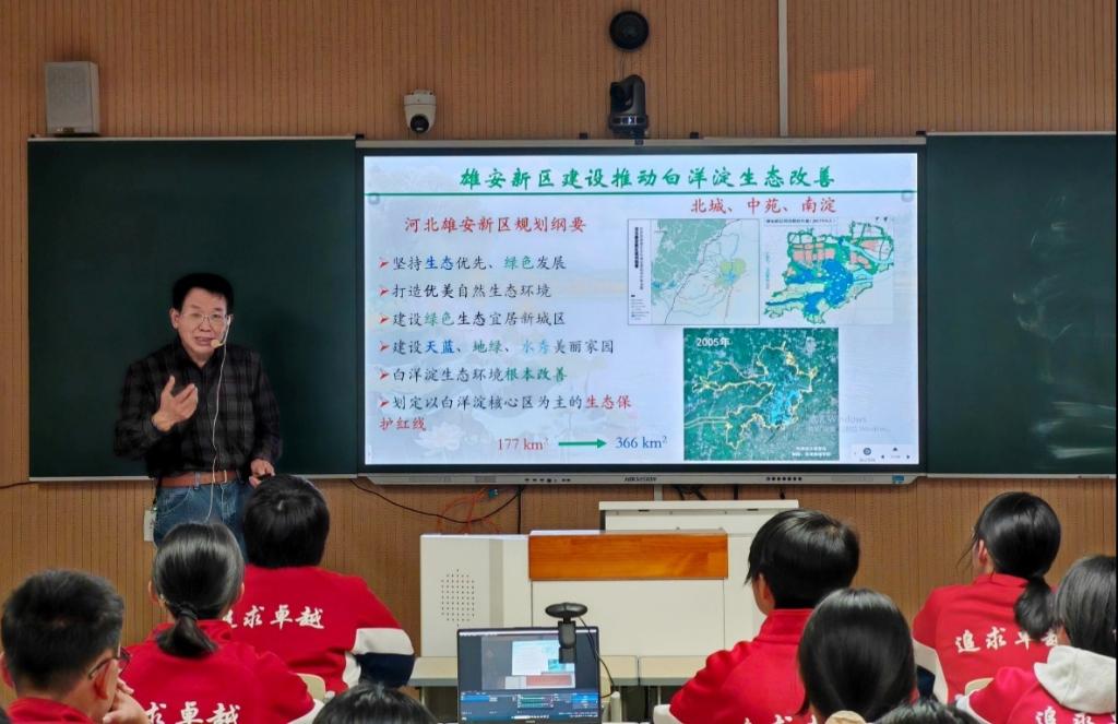 万师强教授以白洋淀的“前世今生”为主线,从历史变迁、红色记忆、生态功能等多个维度展开解读:结合雄安新区设立前后的生态蝶变,生动讲述了白洋淀成为生态治理标杆的历程;串联冀中抗日根据地的红色故事,深刻诠释了湿地生态与民族精神的共生;以“地球之肾”的形象比喻,深入浅出地解析了湿地在调节气候、净化水质、维持生物多样性等方面的核心生态价值。