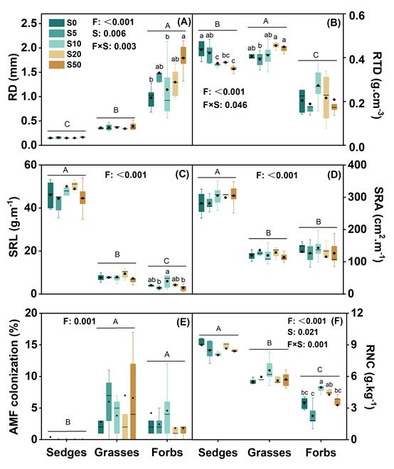 图3 硫添加对植物功能群根系功能性状,AMF侵染率和根氮含量的影响