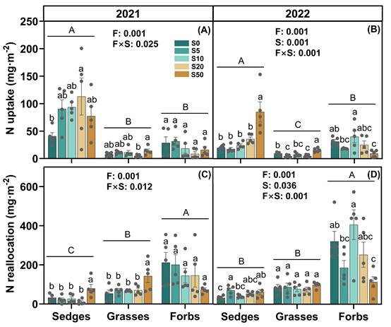 图2 硫添加导致的土壤酸化对莎草、禾草和杂类草直接氮吸收和根氮再分配的影响