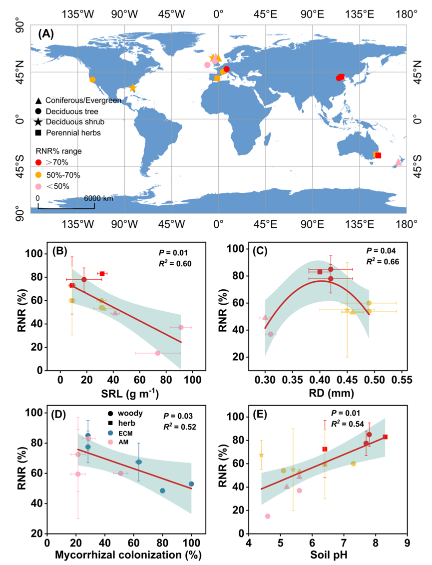 图1 根氮再分配(RNR)研究在全球范围的分布情况(A),以及根氮再分配与比根长(SRL, B),根直径(RD, C),菌根侵染率(D)和土壤pH(E)的相关关系。