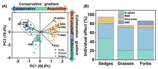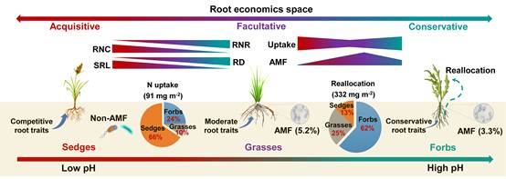 根氮再分配(RNR)作为植物从土壤直接吸收氮素的互补氮利用策略,在促进植物地上部生长和维持物种共存方面发挥着关键作用,特别是在多年生植物占优势的草地生态系统中。然而,目前关于根氮再分配对植物生长的贡献程度,及其在根系经济空间中的定位研究仍处于空白阶段。