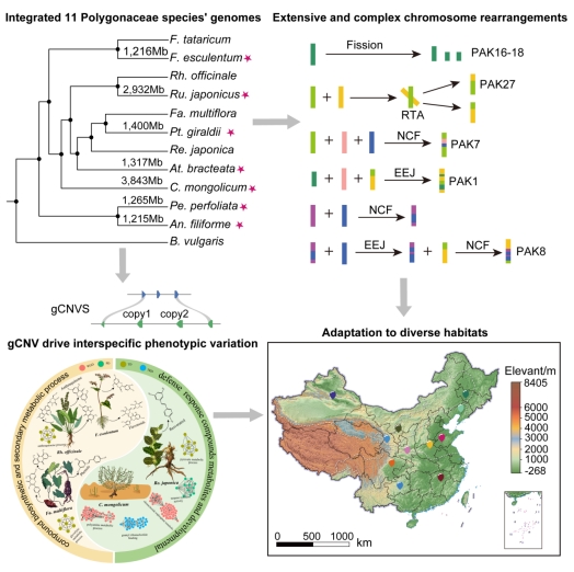 为解析蓼科适应性进化的分子机制,本研究选取覆盖中国77% 蓼科属的11个物种(生境跨度为海拔100米湿地至4200米高寒山地),构建高质量多物种基因组数据集。基于该数据集,在基因组水平明确了蓼科10个属的系统演化关系;通过共线性分析证实,蓼科祖先拥有28条染色体,早期经历过全基因组加倍事件,现代物种染色体数(8-12 条)通过大量染色体重排精简形成,解决了长期以来的核型演化争议;而且发现转座子的大量扩增不仅导致蓼科不同物种基因组大小差异显著,还能诱导染色体重排,是驱动核型演化的核心因素;此外,构建的跨属泛基因组(含80,055个基因家族)揭示,私有基因是物种适应不同生境的关键,而基因拷贝数变异则直接影响药用次生代谢物的含量与多样性,为阐明极端生境适应性的分子基础提供了重要依据。