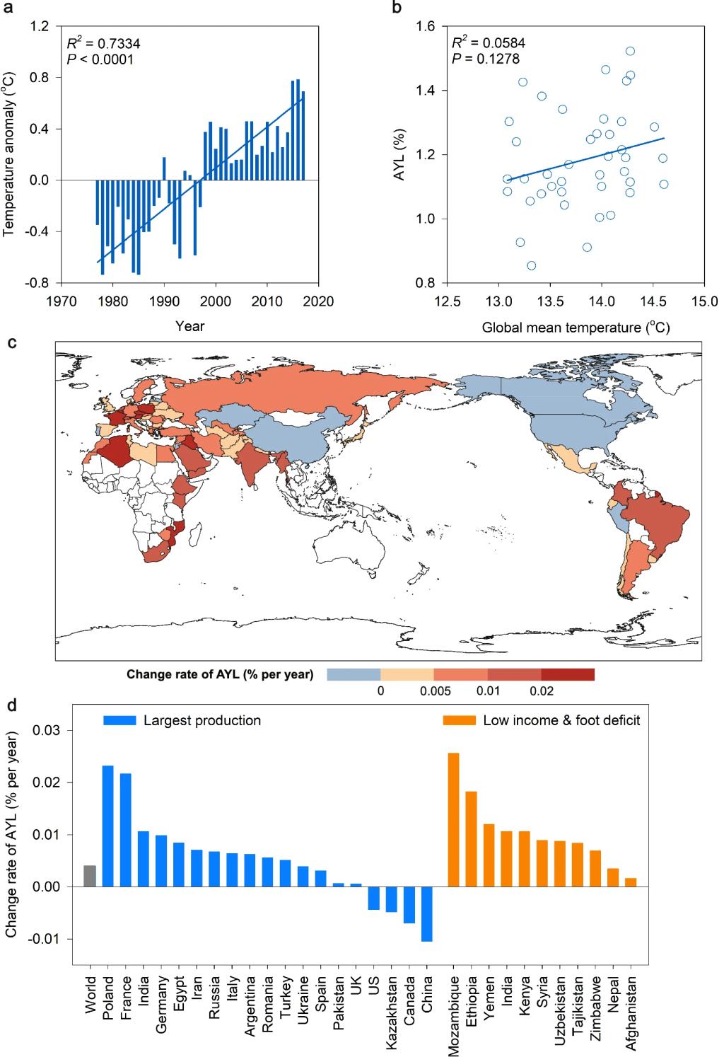 图2. 麦长管蚜体温调节行为导致的全球小麦减产随气候变暖的趋势