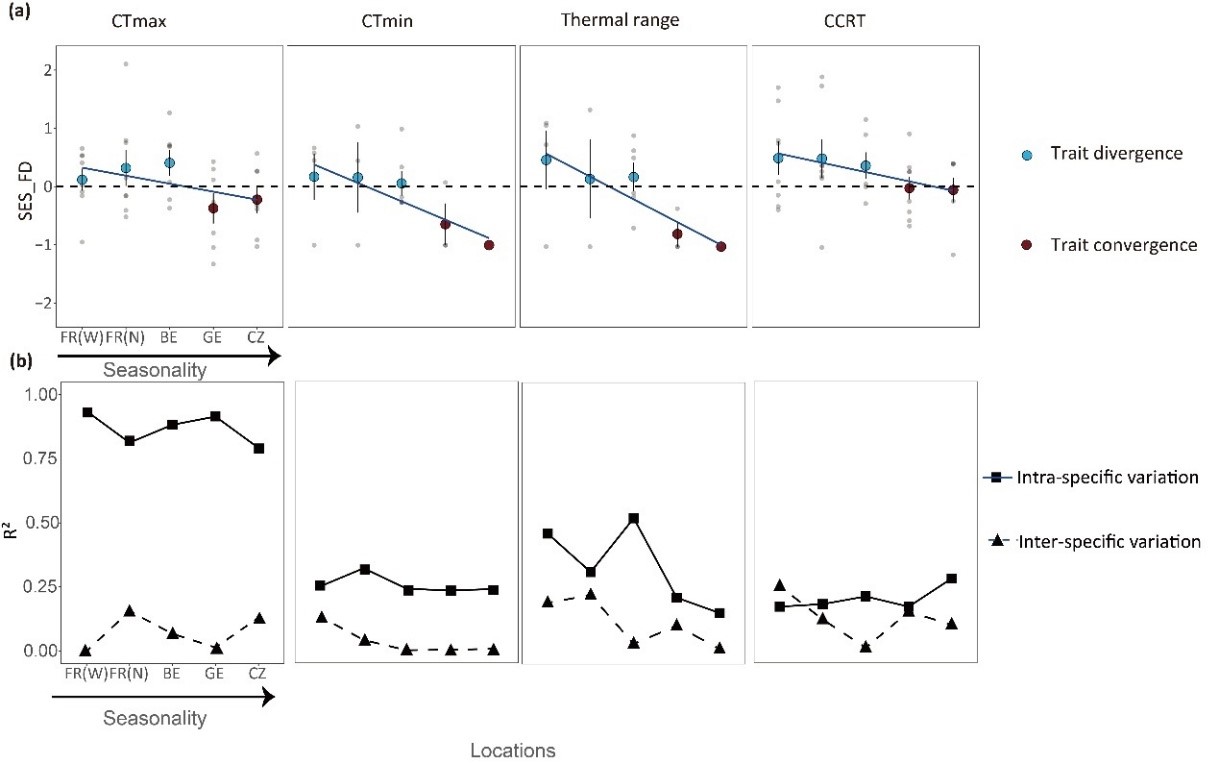 气候变化正在重塑农业害虫的发生格局,并为害虫防控带来新的挑战。相较于以往主要关注平均气温升高的研究,温度波动性及季节差异对害虫群落的影响仍缺乏系统认识。近日,河北大学马春森教授团队联合中国农业科学院植物保护研究所及法国雷恩大学-CNRS-ECOBIO 实验室,在国际生态学权威期刊《Ecography》(中科院1区top,5年影响因子IF=6.7)上发表了题为“Temperature variability homogenized thermal responses in an ectotherm community along a European longitudinal gradient”的研究论文。该研究首次将温度波动与季节差异同时纳入蚜虫群落适应性分析,揭示了季节温度波动驱动群落性状趋同的新规律。未来害虫监测与预测应综合考虑极端事件与季节波动对害虫生理和群落结构的影响。