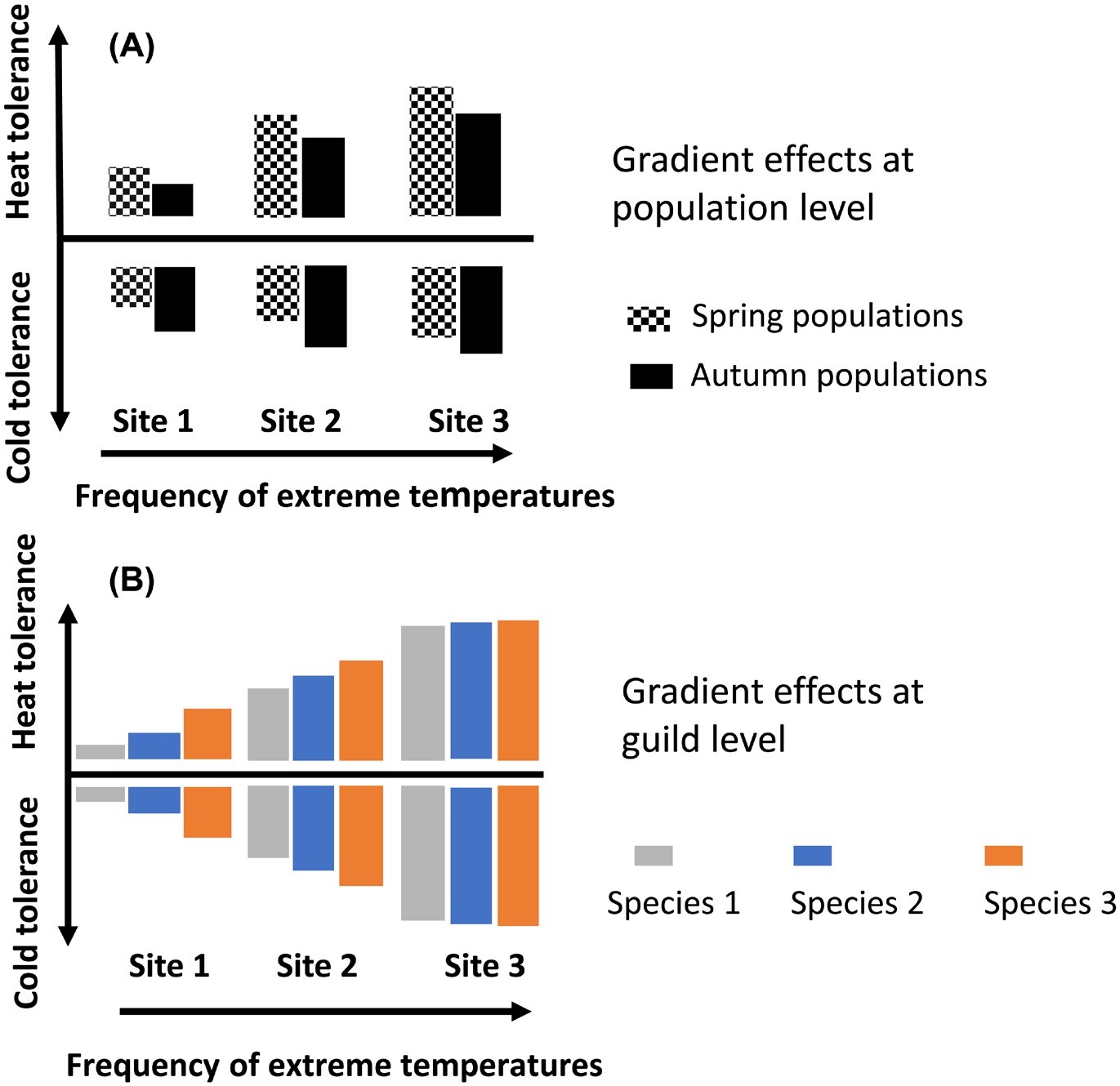 图 1 在纬度相近,沿经度梯度昆虫的温度耐受性的假说:耐热与耐寒性随当地极端温度而变化;同一地点春季种群耐热性更高、秋季种群耐寒性更强,体现季节性适应;在群落水平上,极端温度的选择压力会导致耐热与耐寒性状趋于相似。
