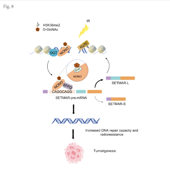 肿瘤在放化疗压力下产生的治疗抵抗是临床肿瘤治疗中的关键挑战,其背后常伴随肿瘤细胞内DNA损伤修复能力异常增强。深入揭示DNA损伤修复关键蛋白的功能与调控机制,对发展新型放化疗增敏策略具有重要科学意义。RNA结合蛋白NONO在DNA损伤修复中扮演关键角色,然而,其功能如何被精准调控,尤其是O-GlcNAc糖基化修饰在其中扮演何种角色,此前尚属未知。