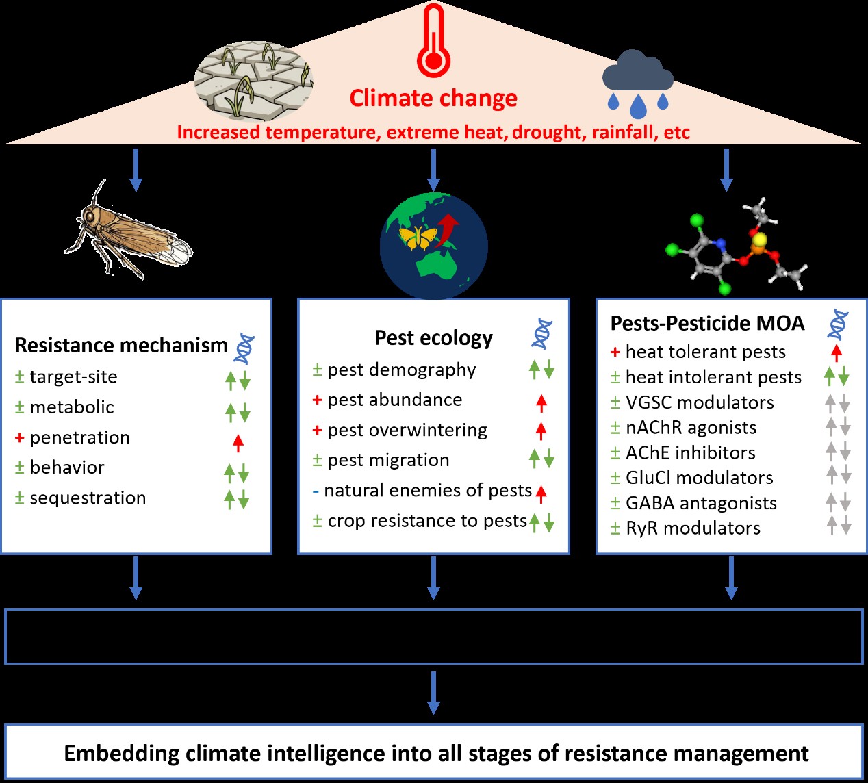 该文从多学科视角出发,系统总结了气候变化影响害虫农药抗性的关键路径:生理与行为机制层面,温度升高可改变害虫代谢速率、解毒酶活性和行为模式,从而影响农药毒力和抗性表达;生态与种群层面,气候变化导致害虫世代加快、种群规模扩大和地理分布北移或扩展,导致农药使用增加,从而加速抗性基因在种群中的积累与传播;进化动力学层面,在气候变暖与高强度农药选择压力的双重作用下,害虫抗性演化呈现出更快速度和更复杂的动态过程;管理与风险层面,传统基于稳定环境假设的抗性管理策略,可能低估了气候变化条件下抗性发展的风险。