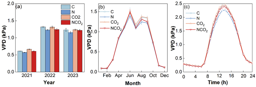 氮添加和二氧化碳增加对水汽压亏缺(VPD,a)的影响,以及水汽压亏缺的季节(b)和日(c)动态